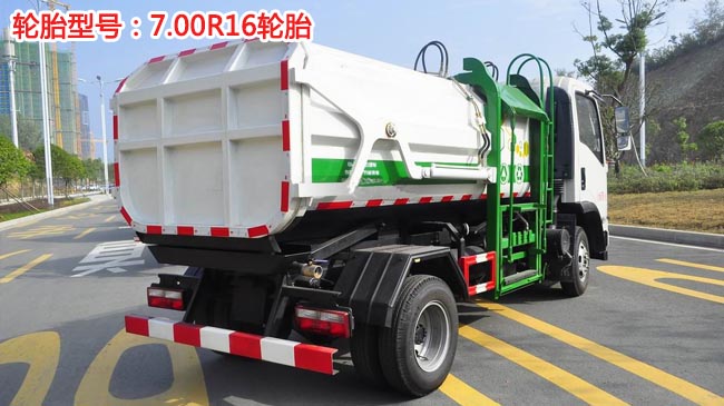 容積5~6立方米,箱體結構為墻板形式,碳鋼材質,厚度邊3底4,國產油泵、多路閥、取力器、油缸,駕駛室外部操作,操作箱帶手油門拉線,主臂油缸帶平衡罰,后門鎖緊為機械鎖緊,后門手動開啟。