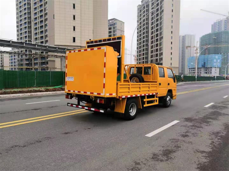 上裝配置:防撞緩沖車尾部設置防撞緩沖塊,防撞緩沖塊采用液壓升降裝置,還配備車載一體化的電子屏、電子箭頭標志牌、頻閃燈及爆閃燈多種警示燈,能夠為后方車輛提供警示和指示方向。箭頭指示標志可對左、右及禁止通行進行導向指示,對道路車輛提供主動安全引導和安全警示,最大限度降低施工對交通流量的影響并確保安全。尾部升降和燈具采用遙控控制,可在車輛附近安全控制防撞緩沖塊的升降和警示燈的開關。