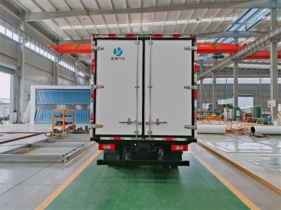 廂體采用內(nèi)外玻璃鋼材料制作,中間夾層為高密度保溫材料,用真空復合一次成型,表面光潔平整,強度高,使用壽命長,廂體邊緣采用優(yōu)質(zhì)鋁合金包邊和專用密封膠處理,具有重量輕、保溫、密封效果好等特點。門框鎖件為不銹鋼材質(zhì),門四周用一次成型密封條密封,廂體外形平整美觀,車廂頂部加以雨檐,避免下雨天雨水對車廂的浸泡,延長廂體使用壽命,車廂內(nèi)配有人性化照明系統(tǒng)。穩(wěn)固性和氣密性是普通冷藏車廂體不可比的,并且具有質(zhì)量輕,抗沖擊力強,無滲透等優(yōu)點。配備國產(chǎn)580制冷機組。