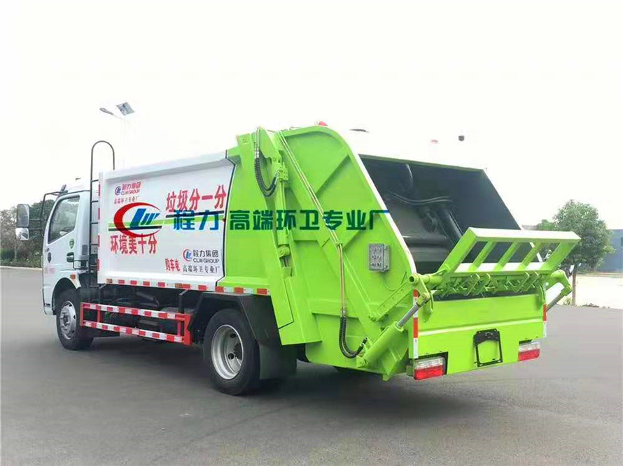 新款平面弧形廂體,廂體材料為武鋼優質碳鋼,外箱尺寸:7340×2350×2800mm,有效壓縮容積8立方,采用邊四底四優質鋼板制作,國內知名品牌博利液壓油缸,杰特油管,揚州中梅多路閥,皖液齒輪油泵,西門子PLC電控開關。壓縮式垃圾車采用機電液一體化技術,借助機、電、液聯合自動控制系統、電腦控制、手動操作系統,通過填裝器和推鏟等專用裝置,實現垃圾倒入、壓碎或壓扁、強力裝填,把垃圾擠入車廂并壓實和推卸,污水全部進入污水收集箱,解決了垃圾運輸過程中的二次污染的問題。壓縮式垃圾車具有自動反復壓縮以及蠕動壓縮功能,壓縮比高、密封性好、裝載量大﹑操作方便、環保性好﹑整車利用功率高等優點。
