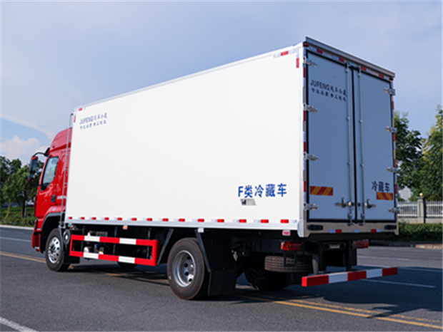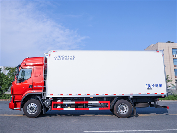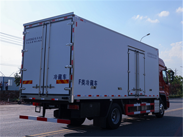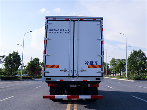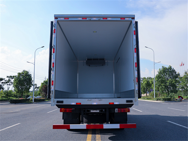 柳汽乘龍6米8冷藏車廂體配置為:斷橋隔溫工藝,整體結構框架,內外面料為3mm新款啞光玻璃鋼夾保溫層真空復合而成,廂體厚度為8cm,最新款鋁合金包邊型材,型材局部厚度為4mm(鋼制鉚釘加固),廂體內部采用2個LED照明燈及廂體示寬燈,后門框不銹鋼材質,門框密封條為三元乙丙橡膠材質,加厚型不銹鋼合頁及鎖件;副梁為Q700車用大梁鋼,15mm厚大梁墊皮,加裝防撞膠塊,不銹鋼門鎖件,配后雙開門,副駕駛一側居中靠前開單側門一個,帶2個排水孔。