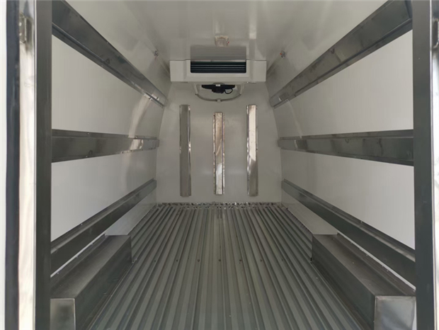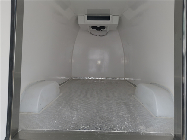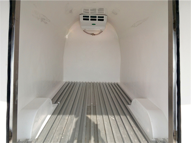 福田G7冷藏車車廂配置為:廂體采用內外優質玻璃鋼板,內膽圓弧式廂體,地板為鋁花紋板,底板和四周廂板加裝通風槽,不銹鋼門框,鎖件。