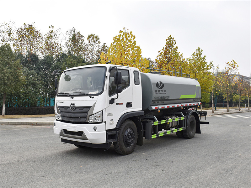 福田新款12-15噸灑水車產品標配前噴(鴨嘴)、后沖、后灑、側噴、后置式工作 平臺,平臺上配置綠化水炮(可 360°旋轉,既可以調成柱狀,也可 以調成霧狀,更可以調成直沖狀、大雨、中雨、小雨、毛毛雨),配 備優質大功率專用灑水泵(可自吸自排,可從河里或池塘抽水到罐體), 取力器,雜物過濾網,消防接口,自流球閥系統、取力器、球閥、濾網 均為國家標準產品,主管道加粗,法蘭墊、法蘭盤加厚,大通徑球閥。 整體具備性能優良安全可靠、效率高、流量大、維修方便等特點